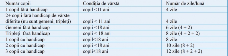 Astfel, noul act normativ consacra 8 zile/luna pentru salariatii parinti ai copiilor incadrati in grad de handicap pana la implinirea varstei de 18 ani pentru un copil, la care se adauga cate 2 zile/luna pentru fiecare copil in plus, in situatia in care sunt doi sau mai multi copii incadrati in grad de handicap.