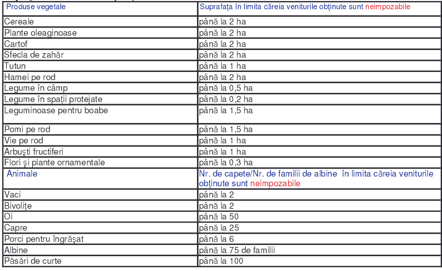 - contibuabilii care obtin venituri din activitati agricole neimpozabile in limitele prevazute in tabelul de mai sus;